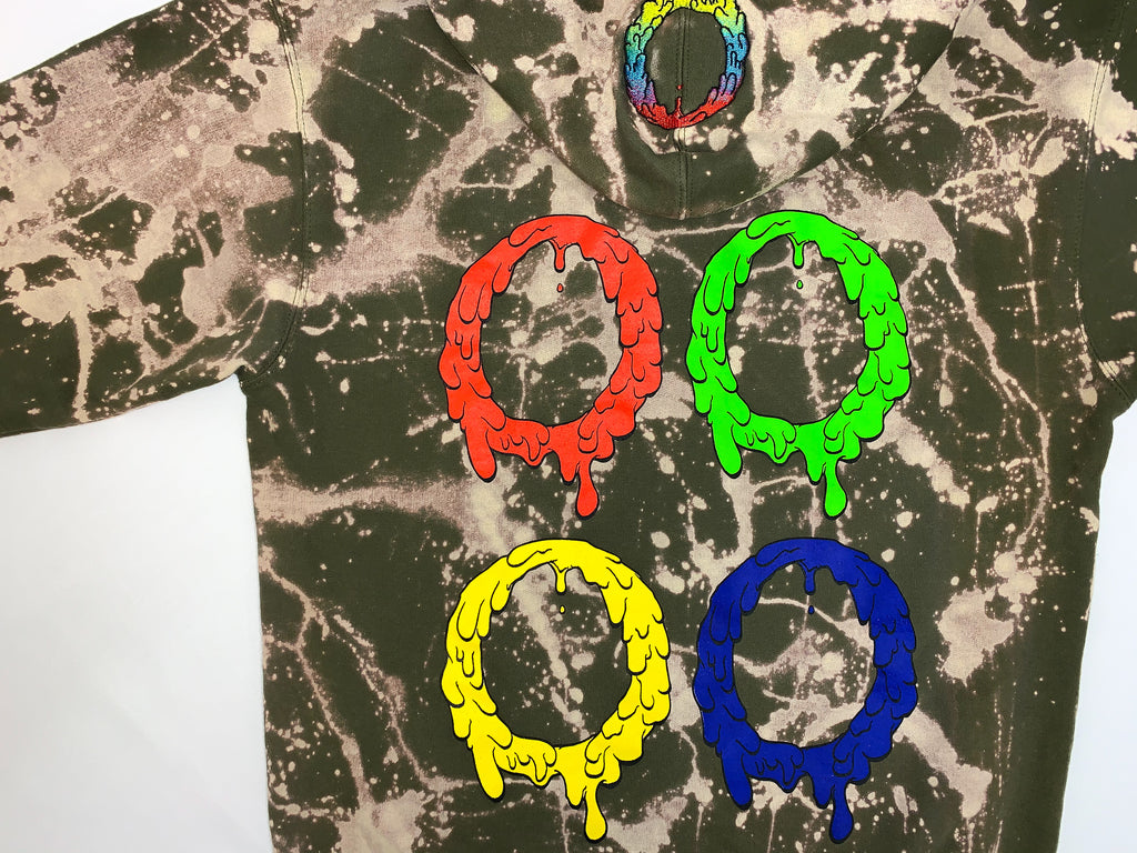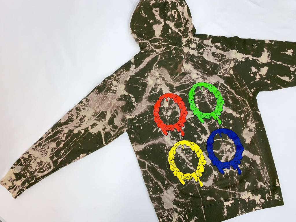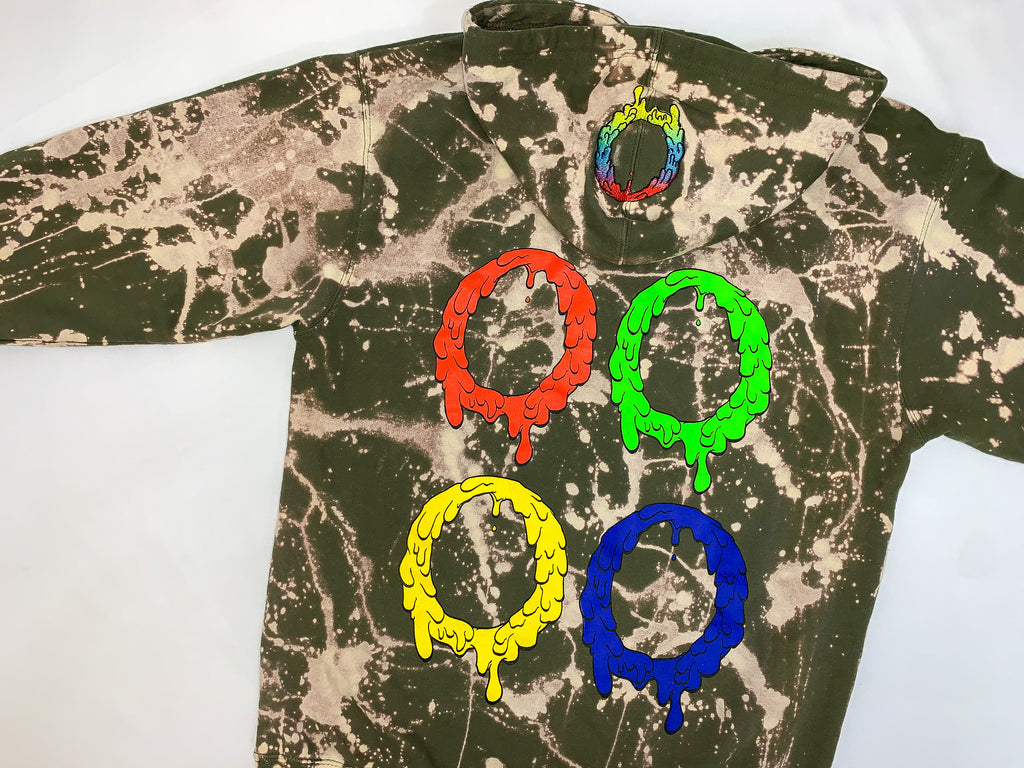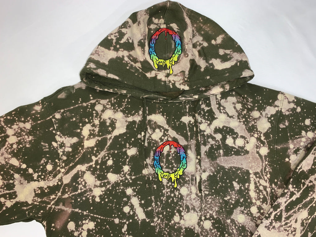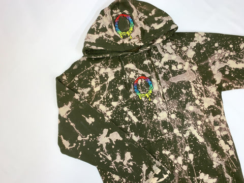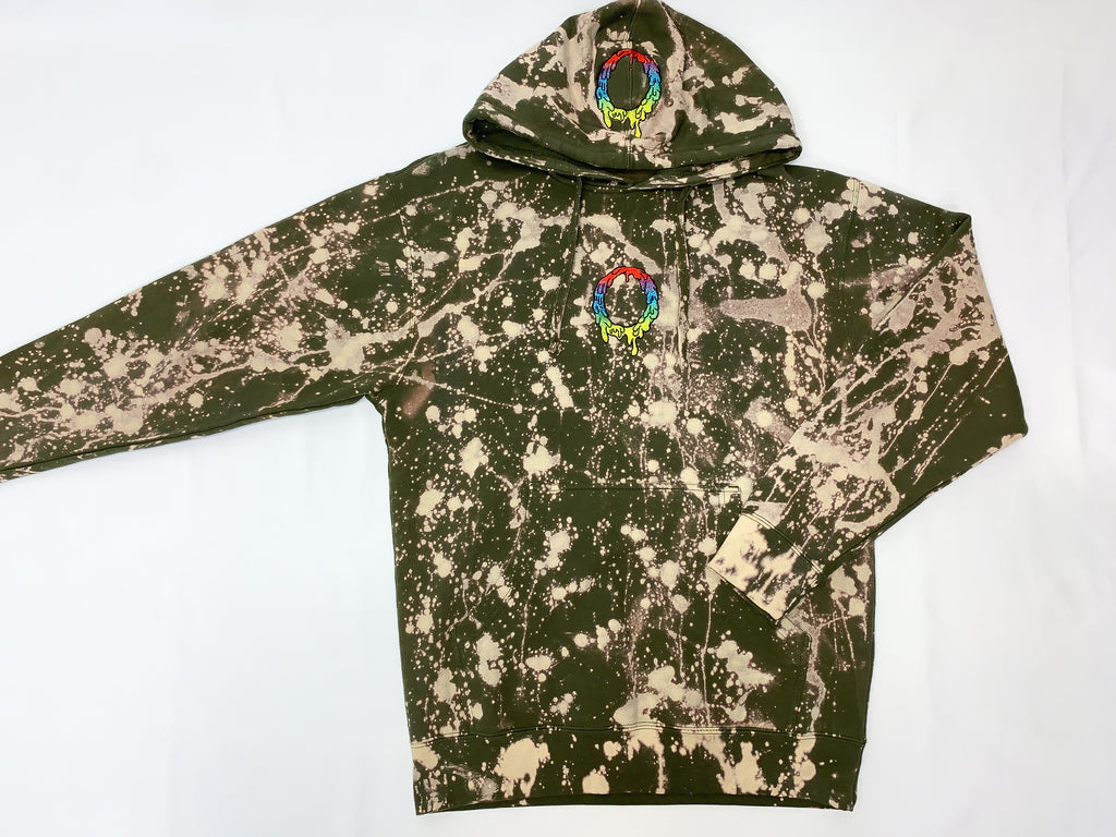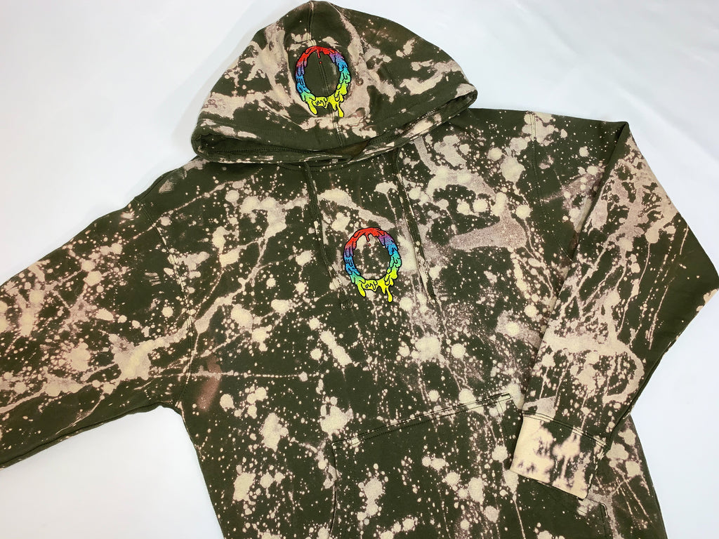 Hand bleached army green 8.5 oz midweight pullover hoodie w/ OG “O” logos embroidered on the center chest and hood