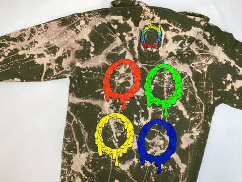 Red, Blue, Green, Yellow “O” logos screen printed on the back
