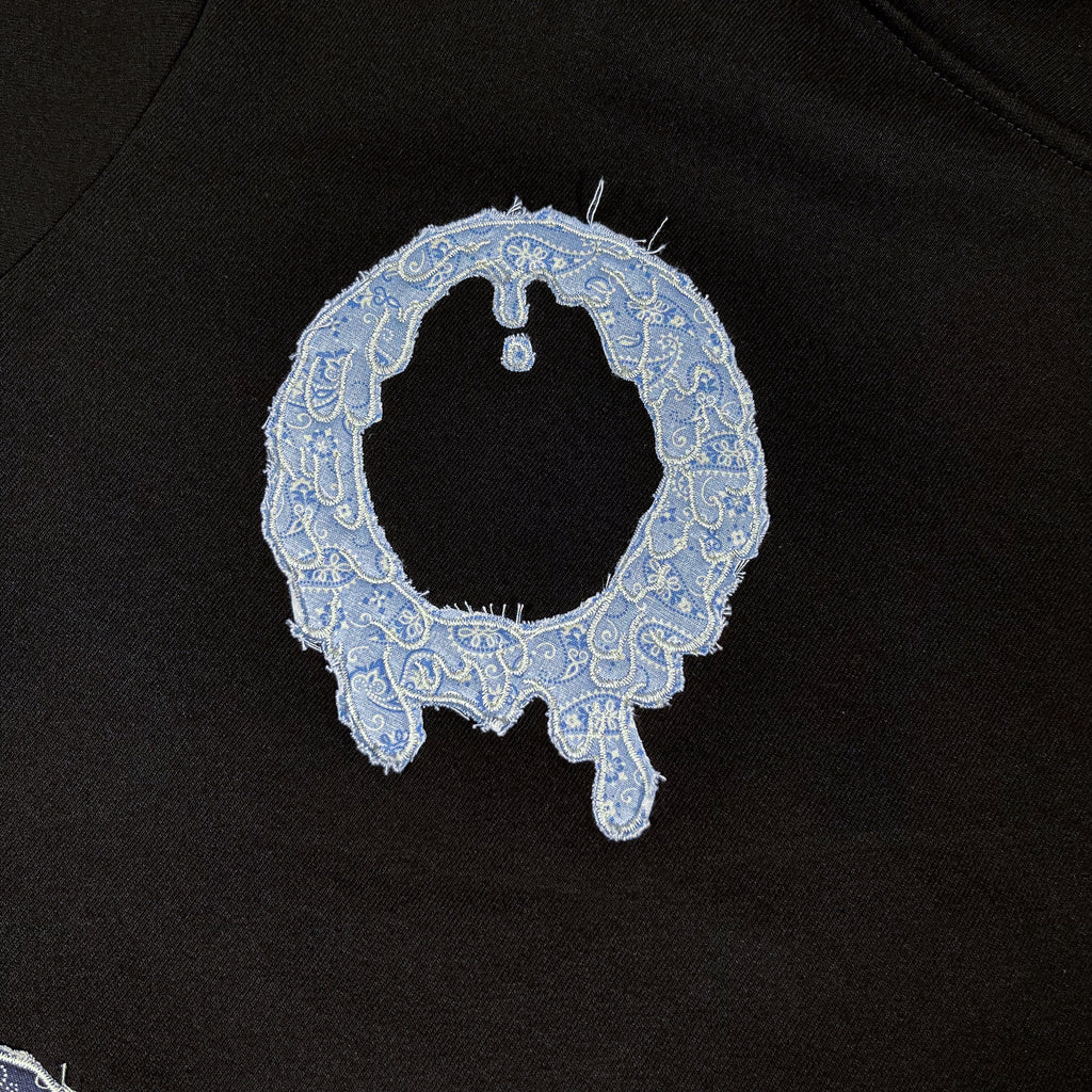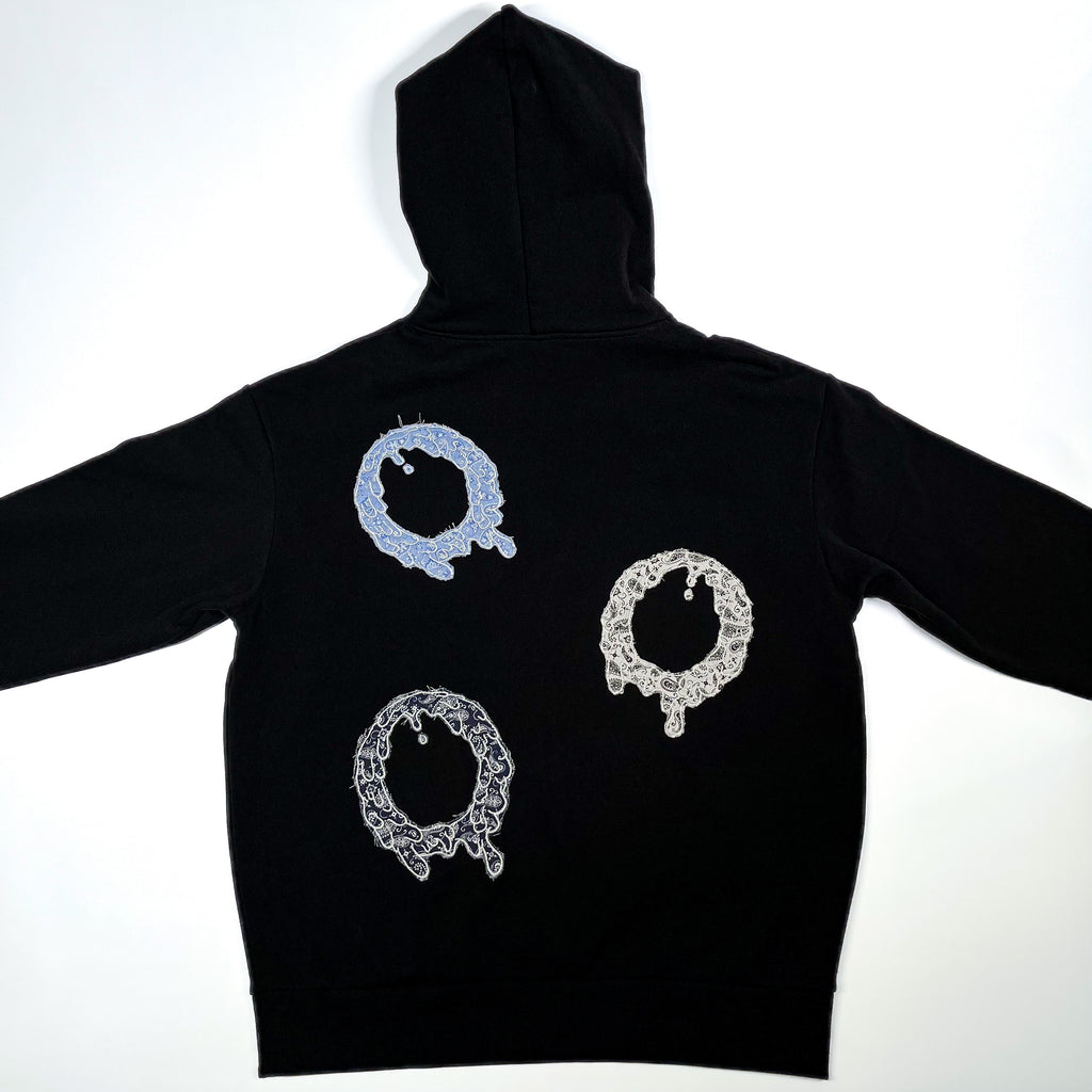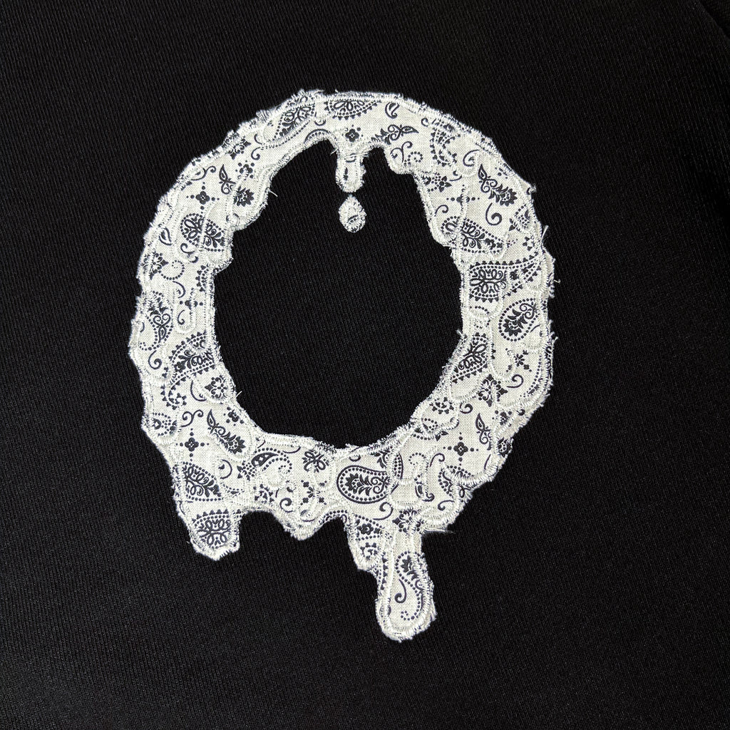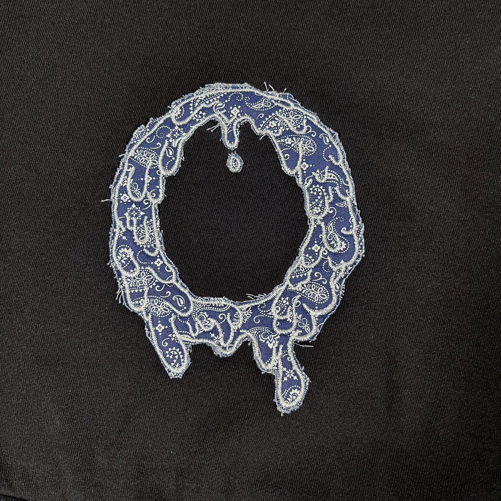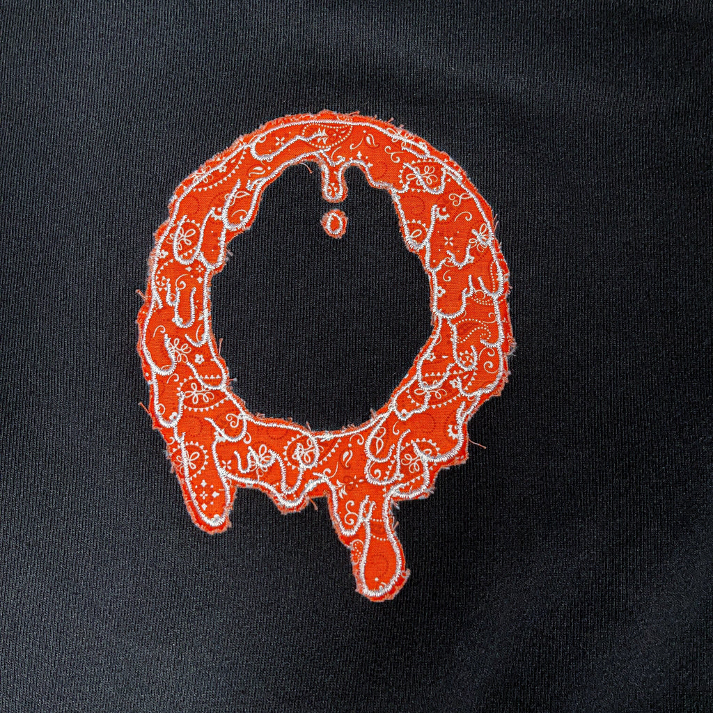 5.5x7.5 inch OG “O” logo outlines embroidered over different color paisley fabric. Embroidered directly onto the hoodie.