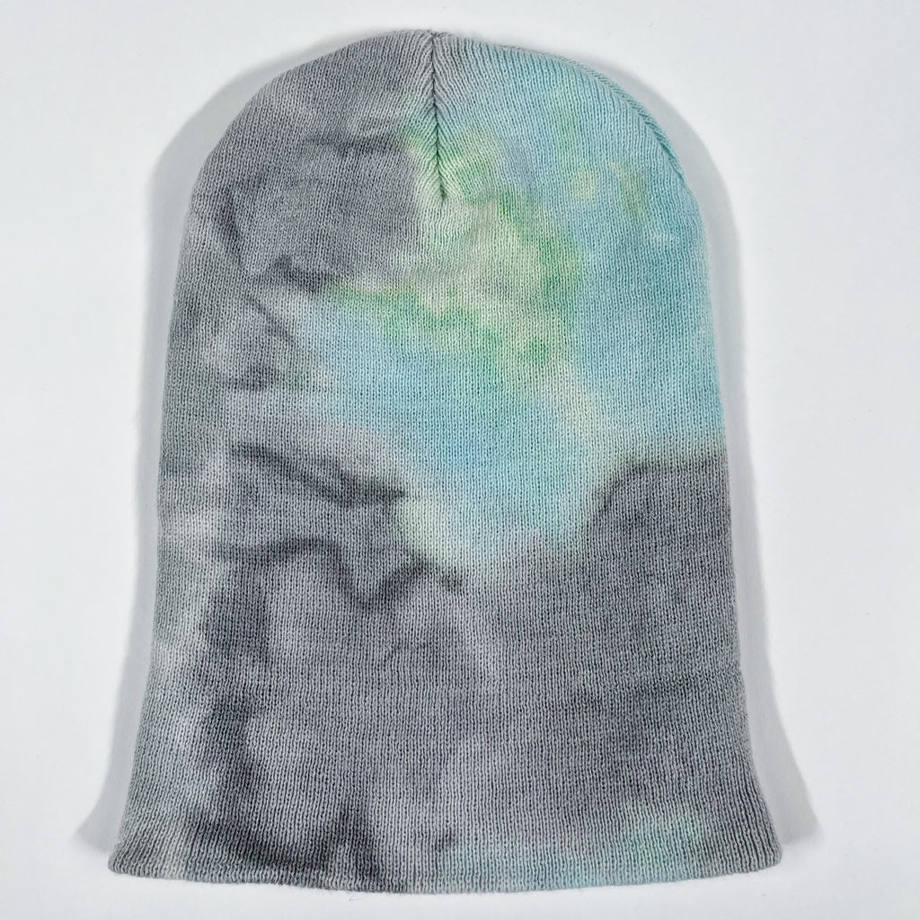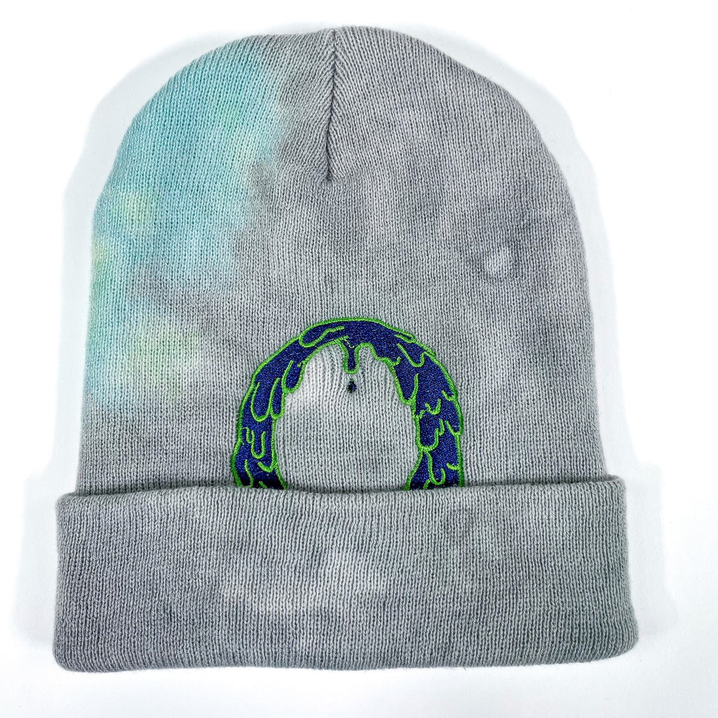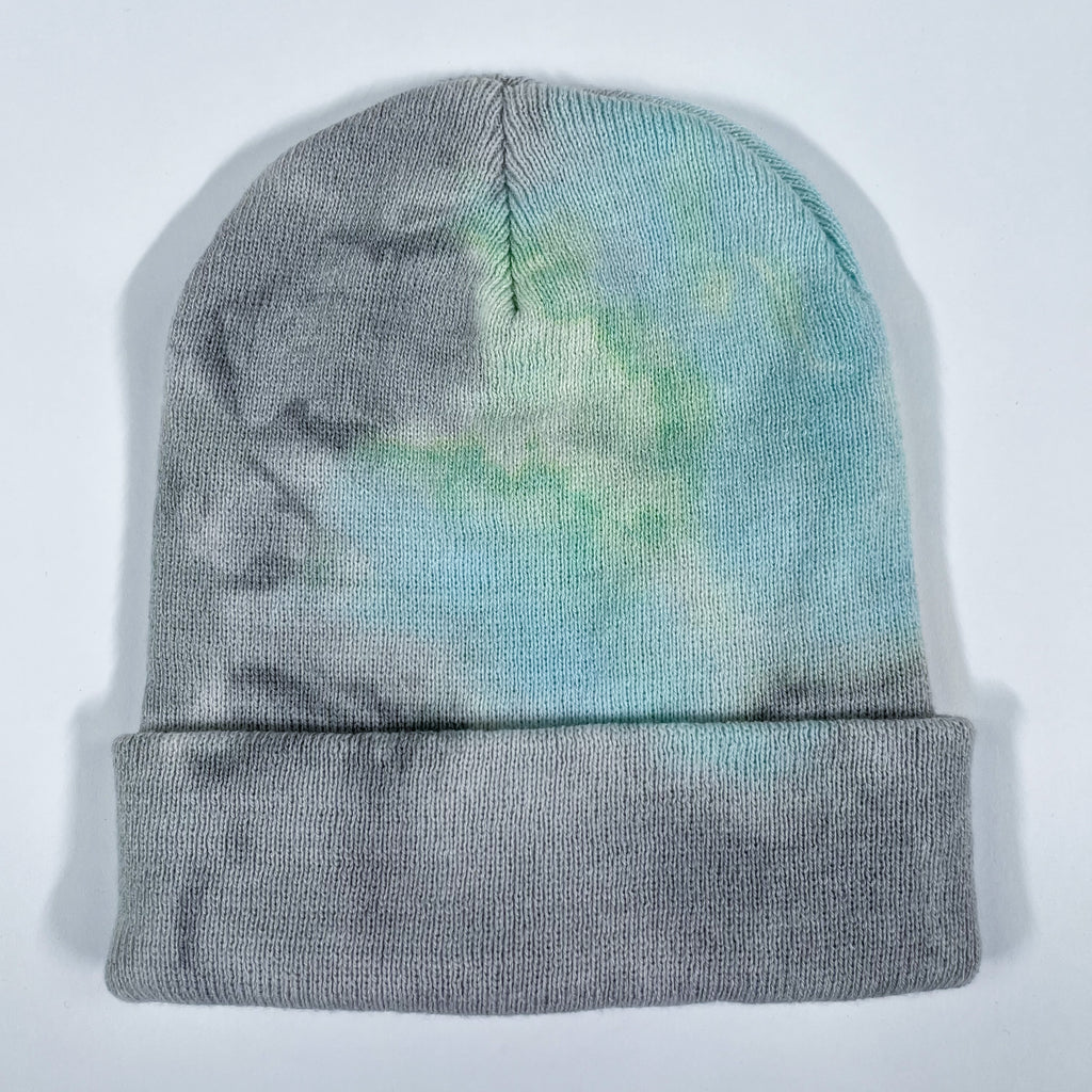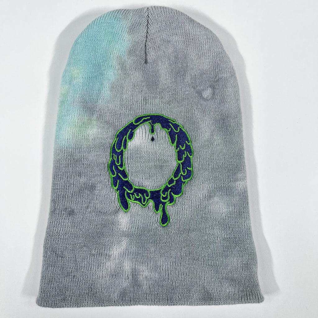 Hand dyed pearl grey/neon green/aquamarine OG “O” logo cuffed beanie